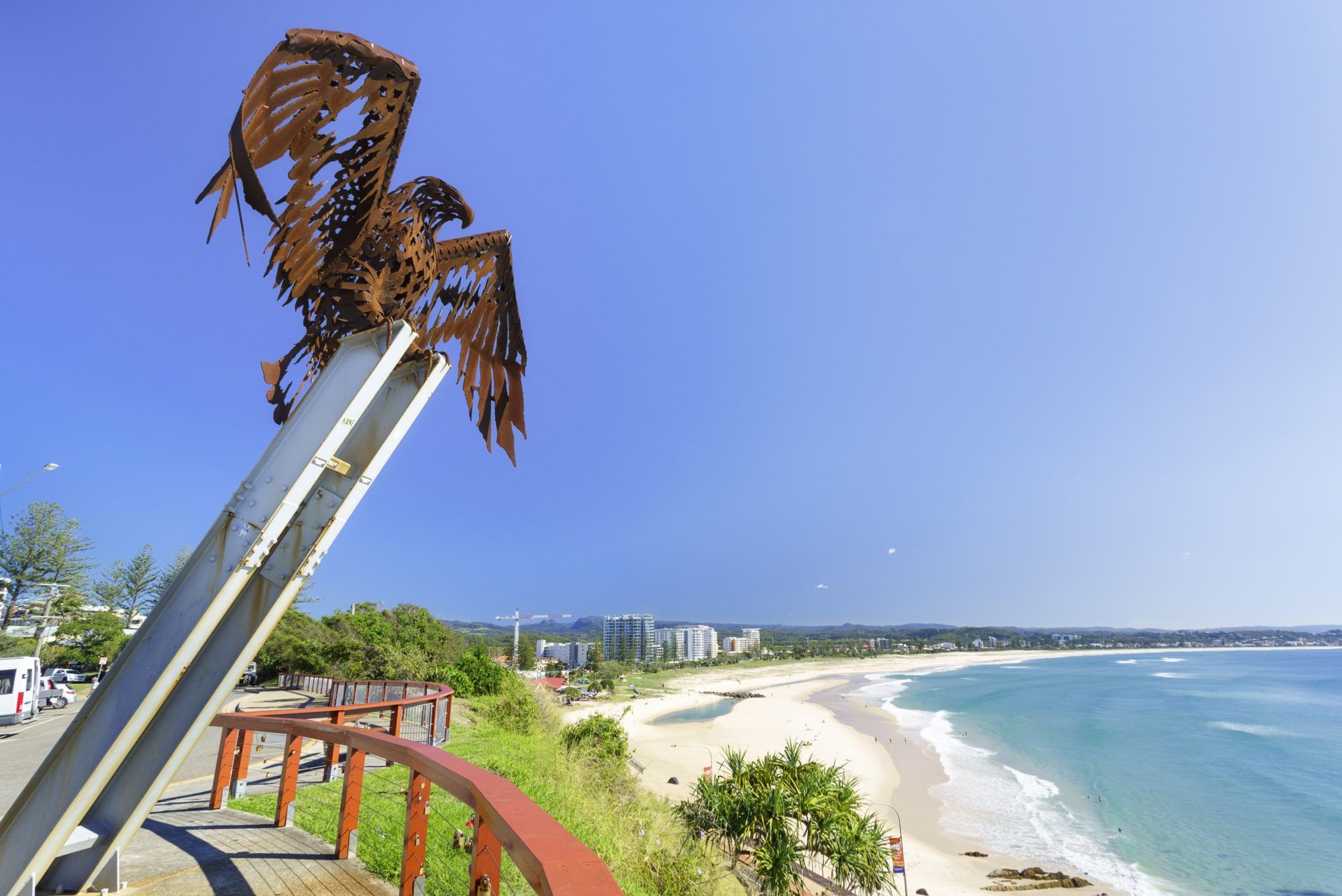 A walk around Kirra Point past the heritage-listed Kirra Pavilion is a must, and be sure to venture to the top of Kirra Hill and share the view of the iron eagle, a sculpture that stands on the lookout for the return of Kirra’s famous waves.